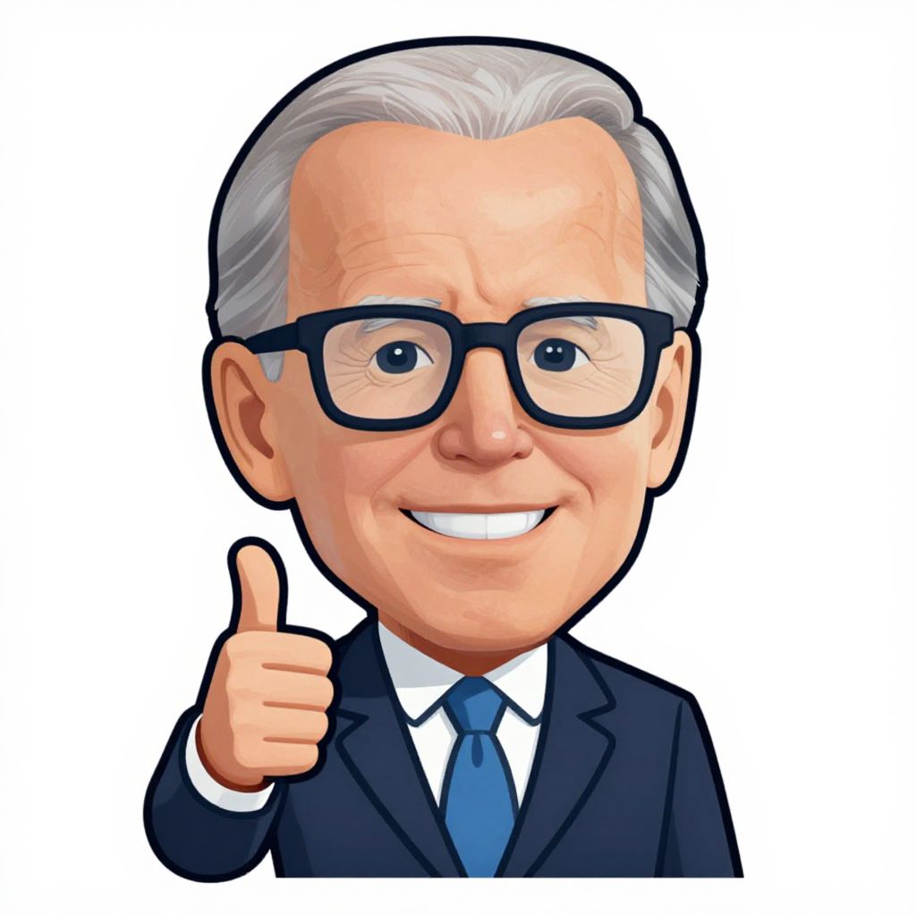 Biden clipart in a cartoonish style, featuring a friendly caricature of a middle-aged man with gray hair and glasses, dressed in a suit, giving a thumbs-up, vibrant colors, clean lines, transparent background, suitable for presentations and digital media.