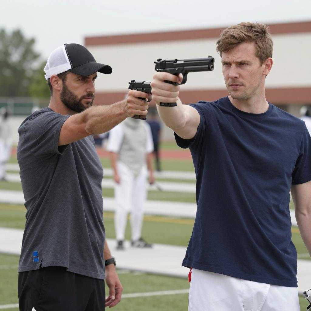 Two men in an outdoor setting. The man on the left, with a beard and wearing a baseball cap, points a gun at the head of the man on the right, who has short brown hair, a navy blue t-shirt, and points a gun back. Background includes blurred fencing and buildings. Both men have intense expressions. The man on the right has his arm extended forward. The man on the left is slightly bent forward.