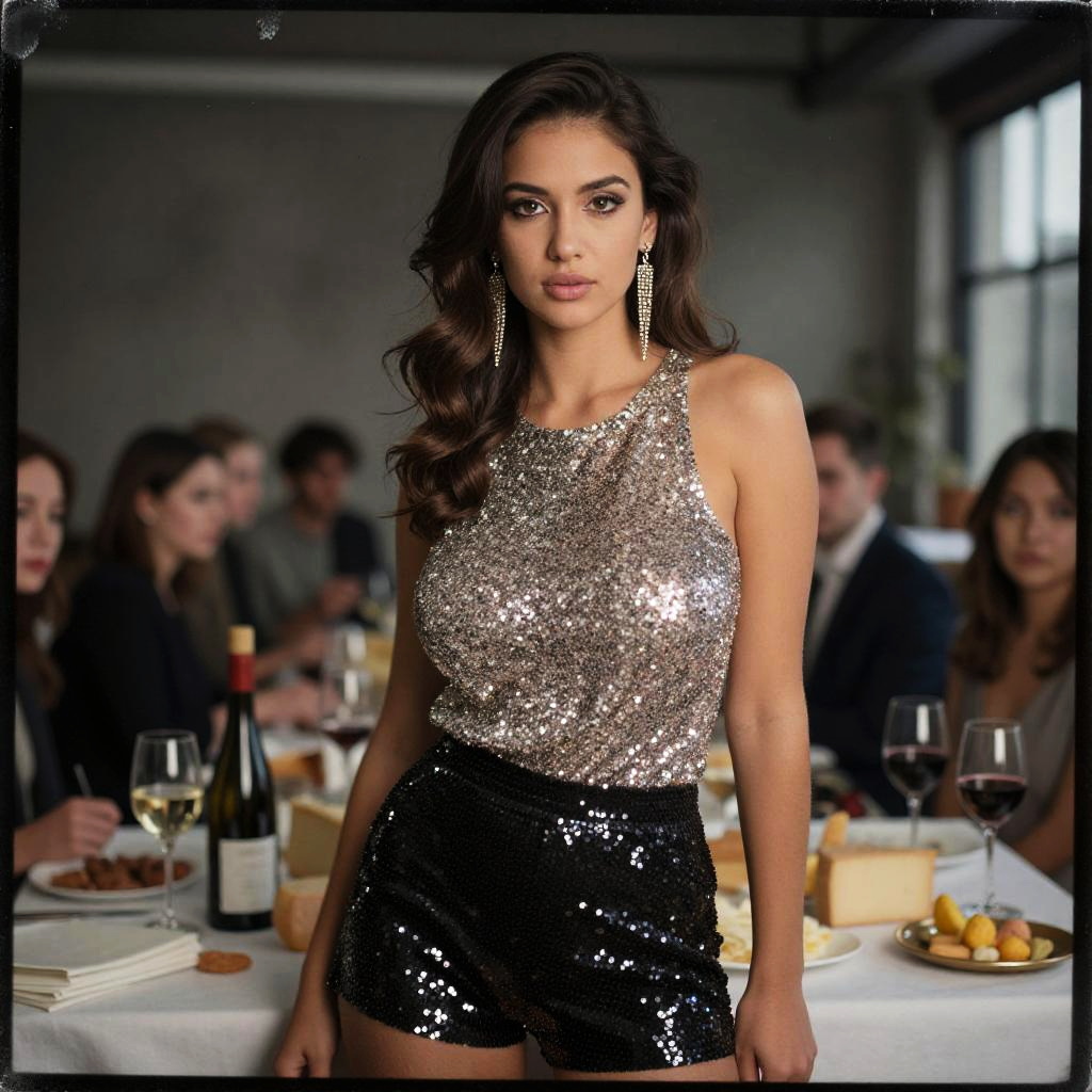 A willowy woman in a glam sleeveless sequined top and black sequined shorts, accessorized with long dangling earrings, stands in a Wine and Cheese Tasting in a Modern Urban Loft, captured in the Calotype process. Sexy. Pretty face and beаutiful eyes. Big breasts