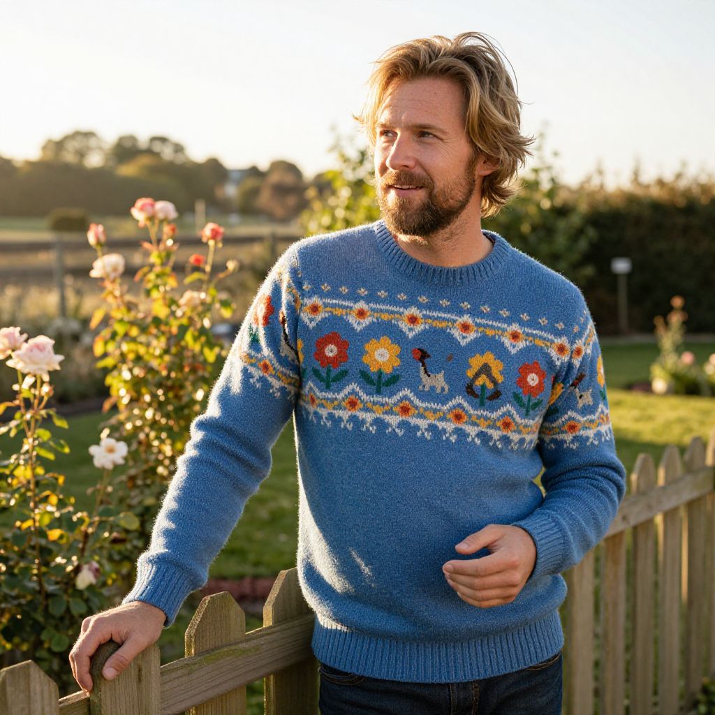A man with warm, tousled blonde hair stands in a sunlit backyard, wearing a cozy blue sweater with a vibrant patterned design of flowers and small animals. He has a friendly, relaxed expression, one hand resting on a wooden fence, the other slightly raised as if gesturing toward the horizon. The scene is softly lit with golden afternoon sunlight, creating gentle shadows and highlighting the texture of the sweater and his well-groomed beard. The background features a garden with blooming roses and a distant tree line, adding a serene and peaceful atmosphere.