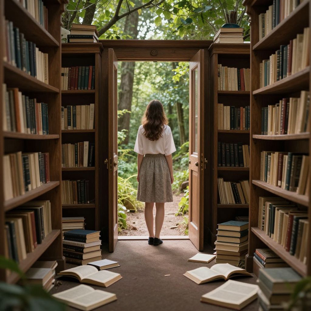 Library doors open to a mystical forest path, where a young woman stands at the threshold, surrounded by wooden shelves filled with books and scattered open volumes on the floor, blending the realms of knowledge and nature seamlessly.