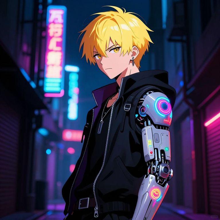 Anime blonde hair boy with a futuristic cyberpunk outfit, cybernetic arm, neon tattoos glowing, standing in a dark alley illuminated by colorful LED signs, intense expression, sharp detailed line art, vivid color palette, high contrast lighting, anime futuristic theme.