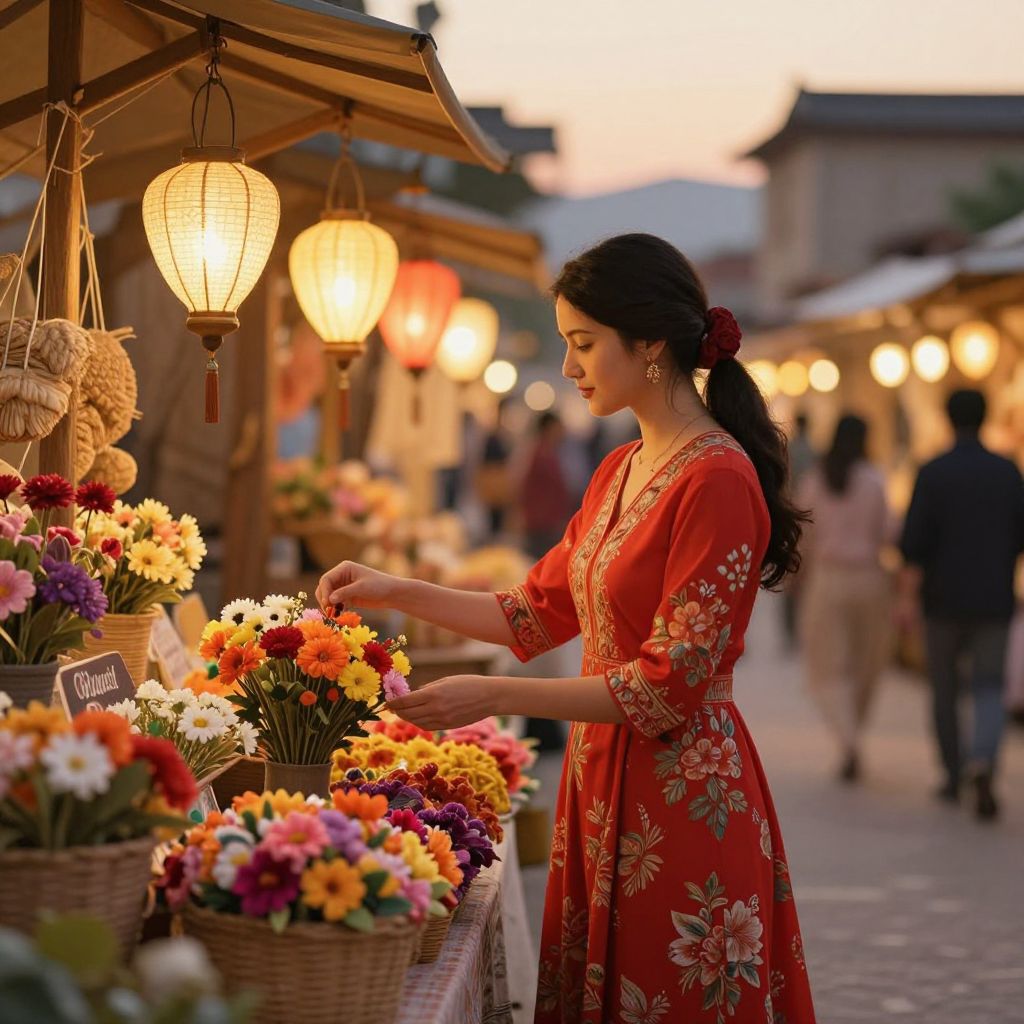 A vibrant digital illustration captures the enchanting ambiance of a bustling market at dusk, where warm golden-hour lighting illuminates a woman in a traditional red dress adorned with floral patterns, as she tenderly selects colorful blooms amidst hanging lanterns and blurred figures, evoking a sense of nostalgia and cultural richness.