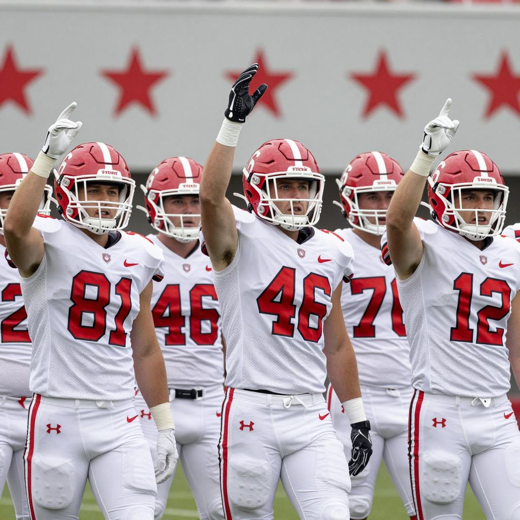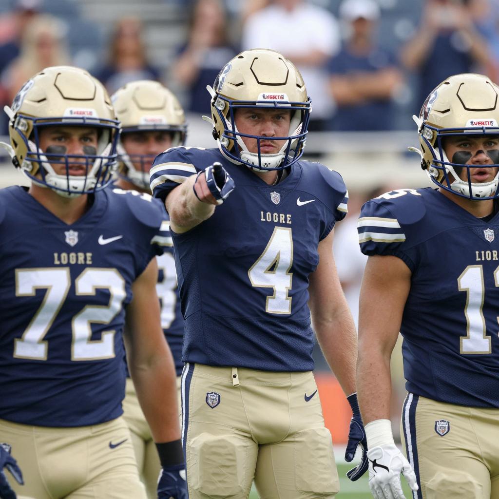 Photograph of a football player wearing a navy blue jersey with white "AFC" letters, a metal helmet, and white gloves. He points with his right index finger, smiling. A referee in black and white striped shirt stands to his left. Another person partially visible behind the player.