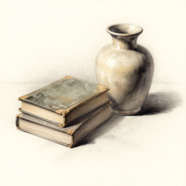 Stable drawing of a still life composition featuring vintage books and a ceramic vase, delicate charcoal strokes and soft gradients, warm and nostalgic mood, carefully balanced elements