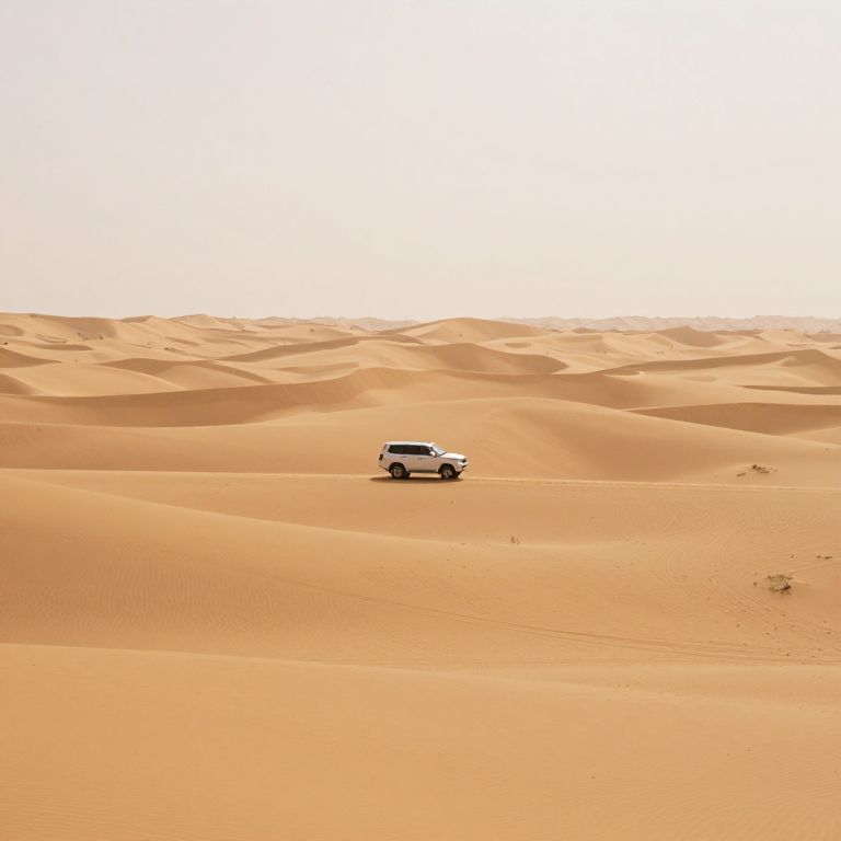Sand dunes stretch endlessly under a hazy sky, their golden curves undulating like waves frozen in time, while a solitary white SUV traverses the vast expanse, dwarfed by the monumental scale of the desert landscape.