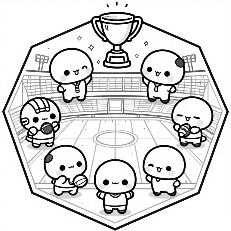 Heptagon kawaii american football coloring page, players celebrating with trophy, different poses, in football playing field, low details, thick lines, in football stadium big,