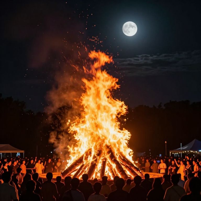 Photograph of a nighttime outdoor gathering featuring a large, bright bonfire at the center. The flames are vivid orange and yellow, with sparks flying upwards. Silhouetted against the dark sky, a full moon shines in the background, illuminating the scene. A crowd of people, mostly in dark clothing, surrounds the fire, some with raised arms. The background includes dark trees and a few white tents. The overall atmosphere is festive and communal, with the bonfire serving as the focal point.