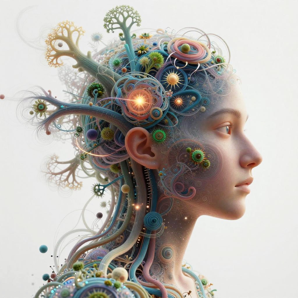 Ai fusion art depicting a seamless merge of human creativity and machine precision, intricate fractal designs overlaying biological forms, ethereal light effects, dynamic composition, a harmonious blend of nature and technology, hyper-realistic style