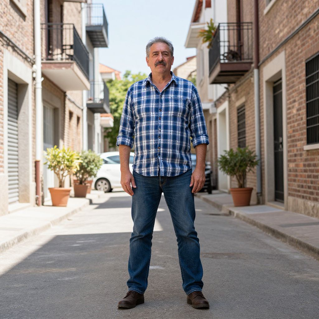 Photograph of a middle-aged man standing confidently in the middle of a narrow, sunlit urban alleyway. He has a mustache, short gray hair, and is wearing a blue and white plaid shirt with rolled-up sleeves, blue jeans, and brown shoes. The alley features brick buildings with black metal balconies, potted plants, and a white car in the background. The sky is bright and clear.