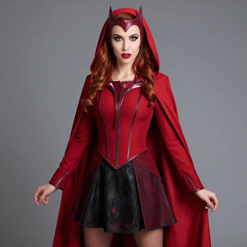 Scarlet Witch Fancy Dress Costume, woman in a red cape and black dress with a red hood
