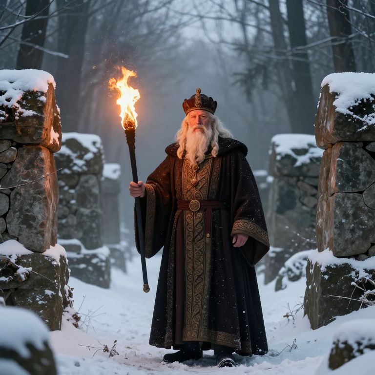 Elderly warrior stands resolute in a snowy forest, wielding a fiery torch that illuminates the path between ancient stone walls, his regal attire and long beard contrasting against the cold, misty surroundings.