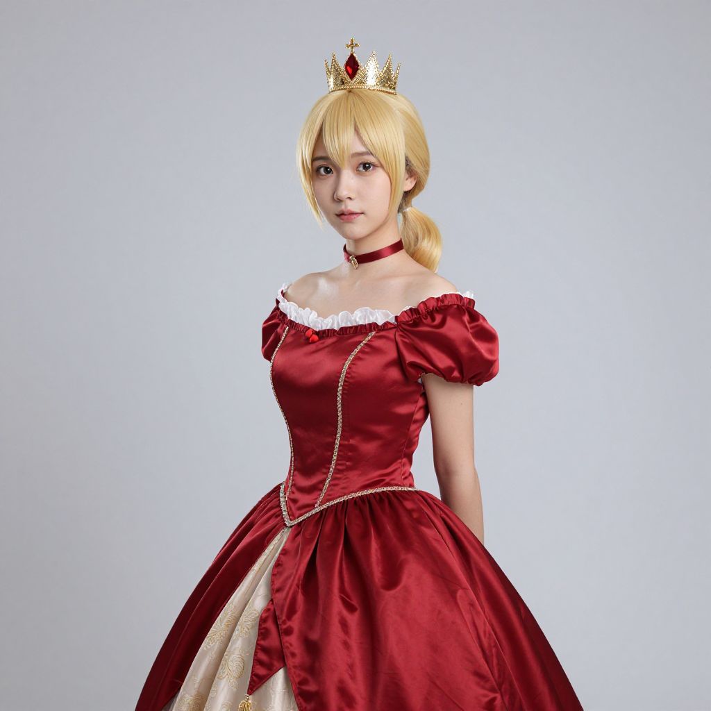 Princess fancy dress costume, 1girl, solo, blonde hair, dress, crown, red dress, tiara, side ponytail, choker