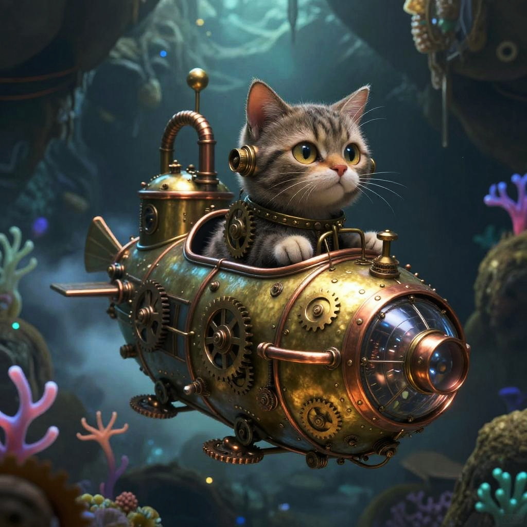 Digital artwork of a cute, wide-eyed tabby kitten piloting a steampunk, golden submarine with gears and a brass dome, floating in a