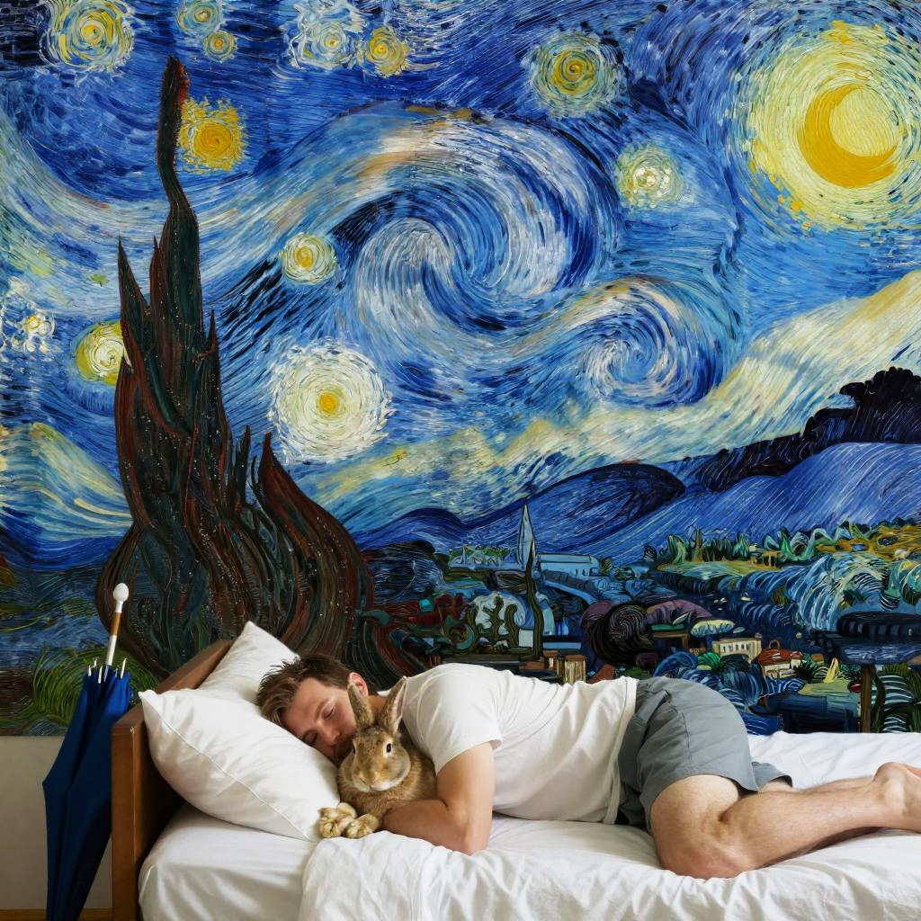Realistic photo.Man with rabbit lying in bed, whimsical landscape with bright colors, swirling skies resembling Van Gogh's style, cartoonish elements, thick tree trunk with umbrella leaning against it, digital illustration inspired by Van Gogh realistic photo