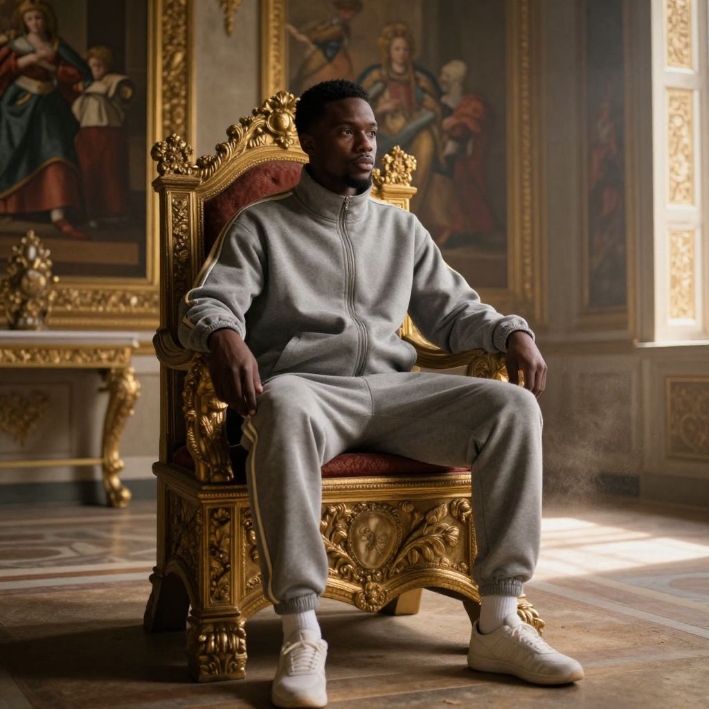 A hyperrealistic Renaissance painting of a black man in a tracksuit, sitting on a throne in a palace interior, with golden hour light shining from the right, featuring ornate Renaissance paintings, soft focus, and a dusty atmosphere.