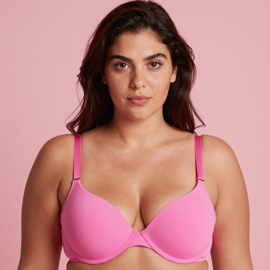 Photograph of a woman with light brown skin, long dark brown hair, and brown eyes. She is wearing a bright pink bra with padded cups, revealing large breasts. She has a neutral facial expression, slightly tilting her head to the right. The background is solid pink. She is positioned center frame, looking directly at the camera.