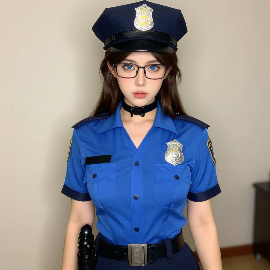 This is a digitally created, photorealistic image of a young child dressed in a miniature police uniform. The child has light skin, brown curly hair, and large, expressive eyes. They wear a dark blue police cap with a gold badge, a light blue short-sleeved shirt with black epaulets, a black tie, and dark blue shorts with a black belt featuring a silver buckle. The child also has a police badge on the left side of the shirt. The background is a blurred indoor setting with wooden doors and a brown dresser on the left. The overall color palette includes shades of blue, brown, and white.