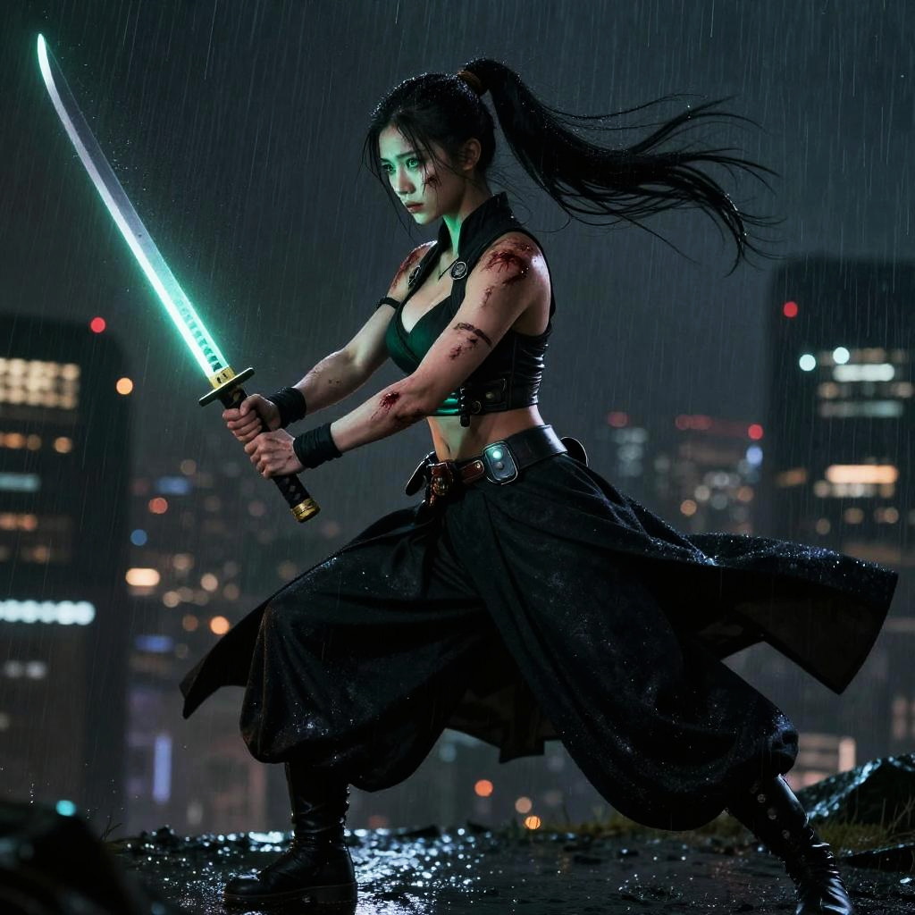 (ultra realistic, 32k, masterpiece:1.1), (high detailed skin:1.1), 8k uhd, dslr, high quality, 1girl, (high ponytail, long ponytail, green eyes, large breast, fit slim body), (a woman in a long cloak and skirt in tachi no tori stance), tachi no tori stance, (futuristic clothing), (night:1.4), (devastated:1.4), (wind:1.5), (cyberpunk city), (((raining))), battle scars and bloody, wielding a neon katana, elaborate scene style, glitter, (cinematic, black and green tones), realistic style, 8k, exposure blend, full body shot, action shot, cinematic movie scene, nebula sky, bokeh, (hdr:1.4), high contrast, orange and white film), (muted colors, dim colors, soothing tones:1.3), low saturation, (hyperdetailed:1.2), ray tracing, (noir:0.4)