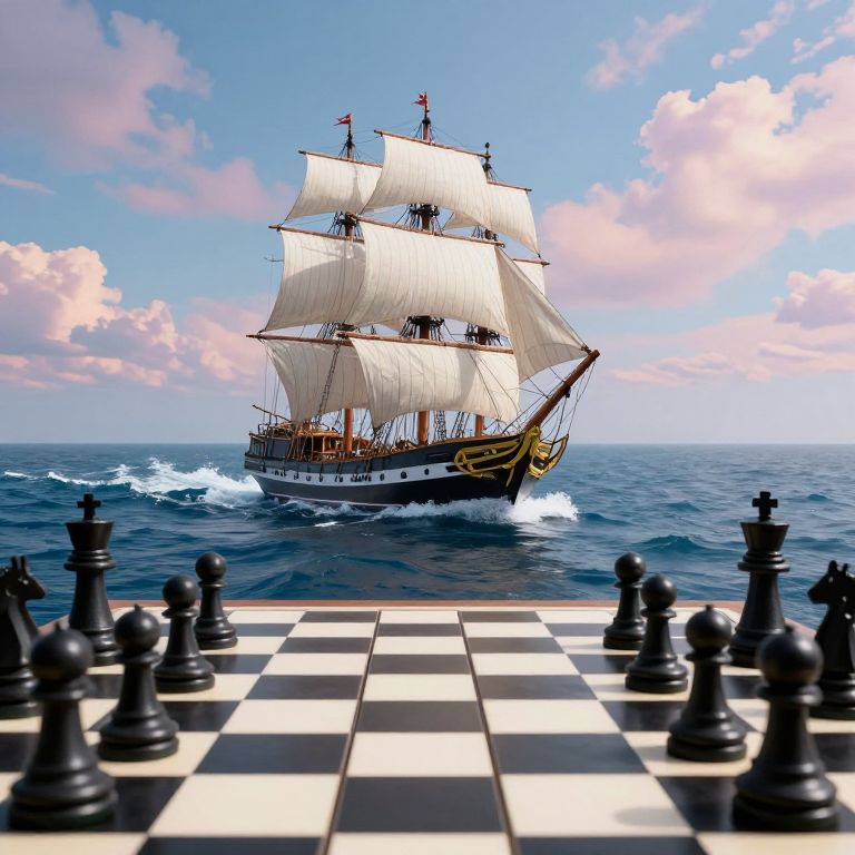 Photorealistic image of a grand sailing ship with white sails on a blue ocean, viewed through a black-and-white chessboard foreground.