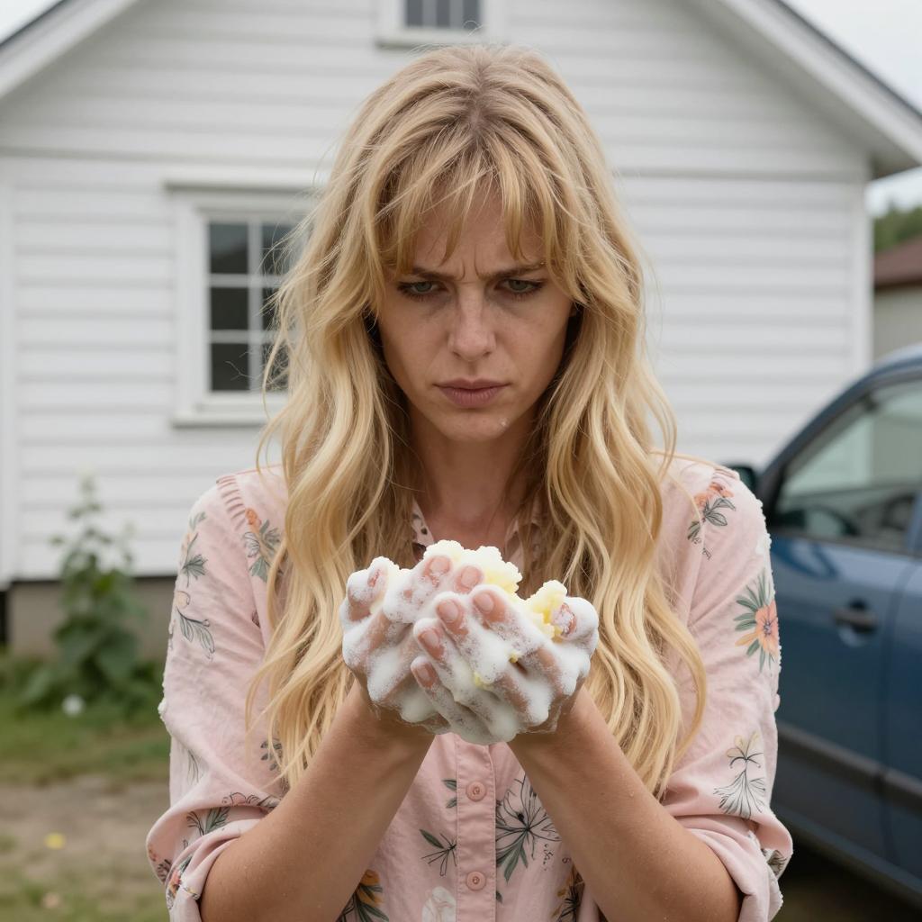 Blonde woman with long, wavy hair and bangs, wearing a pink floral shirt, standing outdoors. Hands covered in white and yellowish foam-like substance. Blue car on the right. White wooden house in the background with small windows and some greenery. Intense expression on her face. Two hands in front of her chest. One hand holds a hairy object covered in foam.