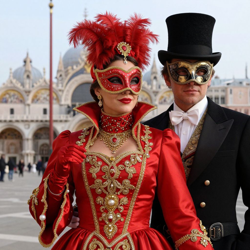 A vibrant digital rendering captures the opulent essence of a masked ball at St. Mark's Square in Venice, featuring a woman in a striking red coat adorned with intricate gold embellishments and a man in a black top hat and ornate mask, exuding a high-definition, theatrical elegance reminiscent of classic Venetian carnival celebrations.