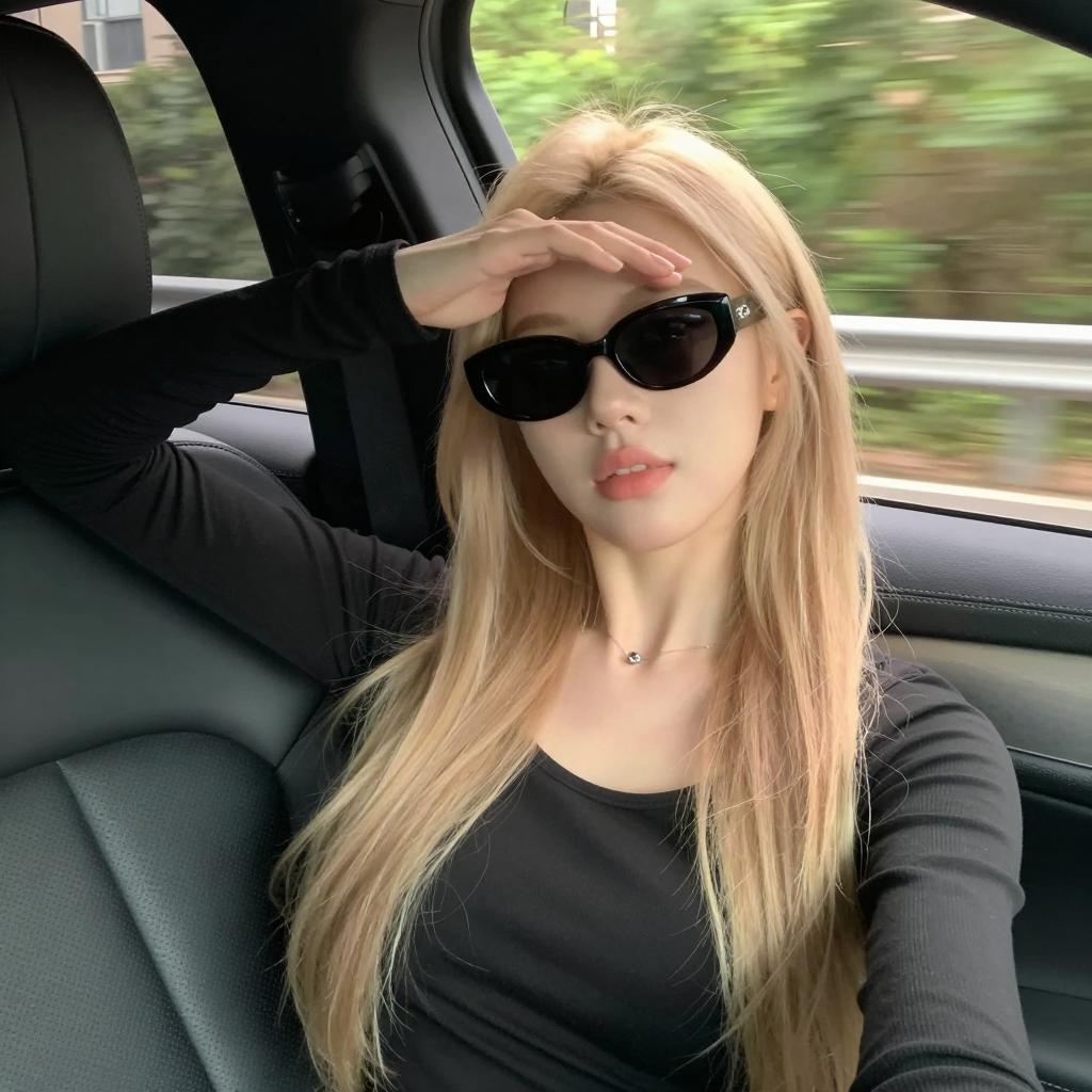 Blonde woman with long hair, wearing black sunglasses and black long-sleeve top, sits in car seat, right hand shading eyes. Black leather seat and window with green trees visible in background. She has light skin, full lips, small silver necklace. Photo.