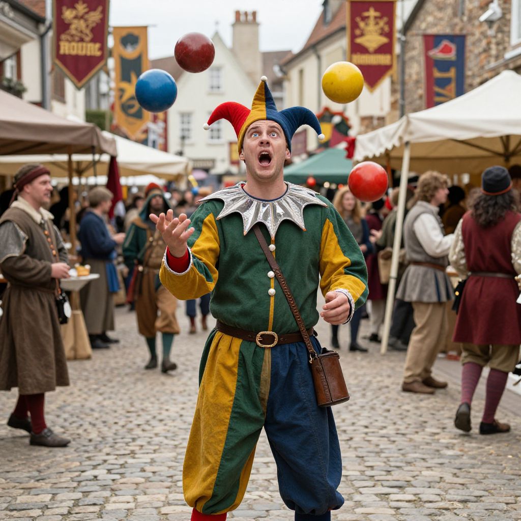 Witty medieval jester juggling colorful balls in a lively market square, vibrant costumes, exaggerated expressions, detailed cobblestone and banners, capturing playful humor and historical charm