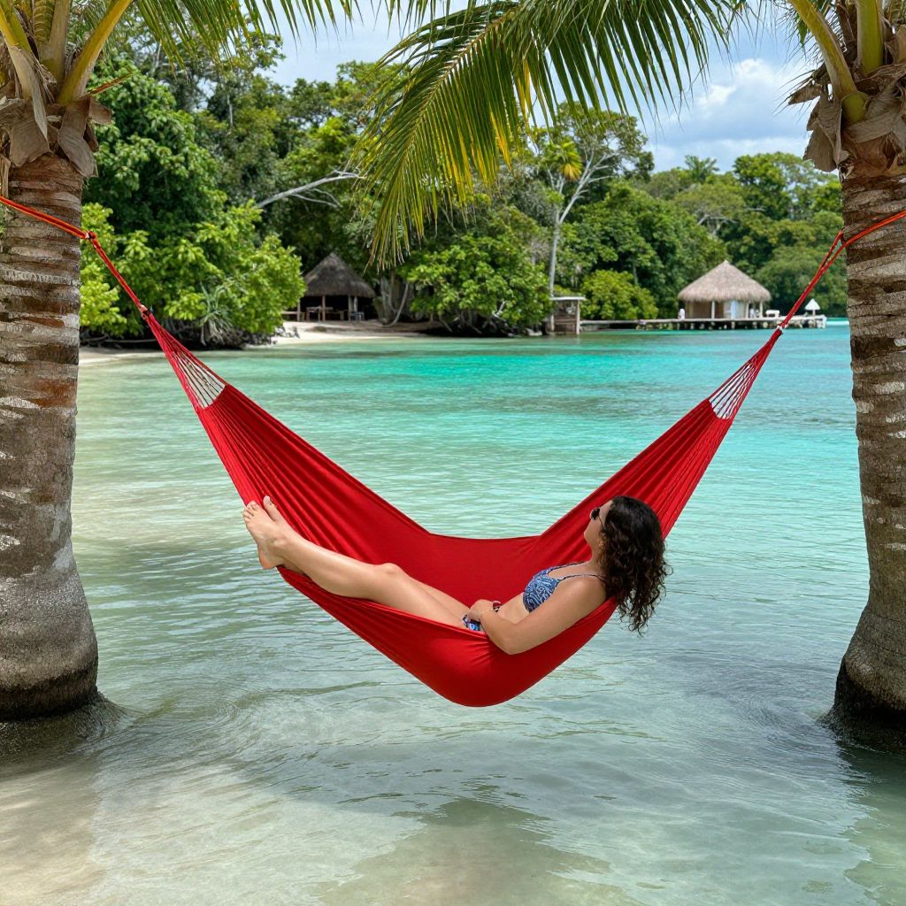 Photograph of a woman with curly brown hair lounging in a bright red hammock, strung between two palm trees over clear turquoise water. She wears a blue and white patterned bikini. The background features lush green trees and a thatched-roof hut on a tropical island. The hammock's fabric is taut, and the water's surface is calm. The image is vibrant, with a strong contrast between the red hammock and the blue-green water, capturing a serene, tropical beach setting.