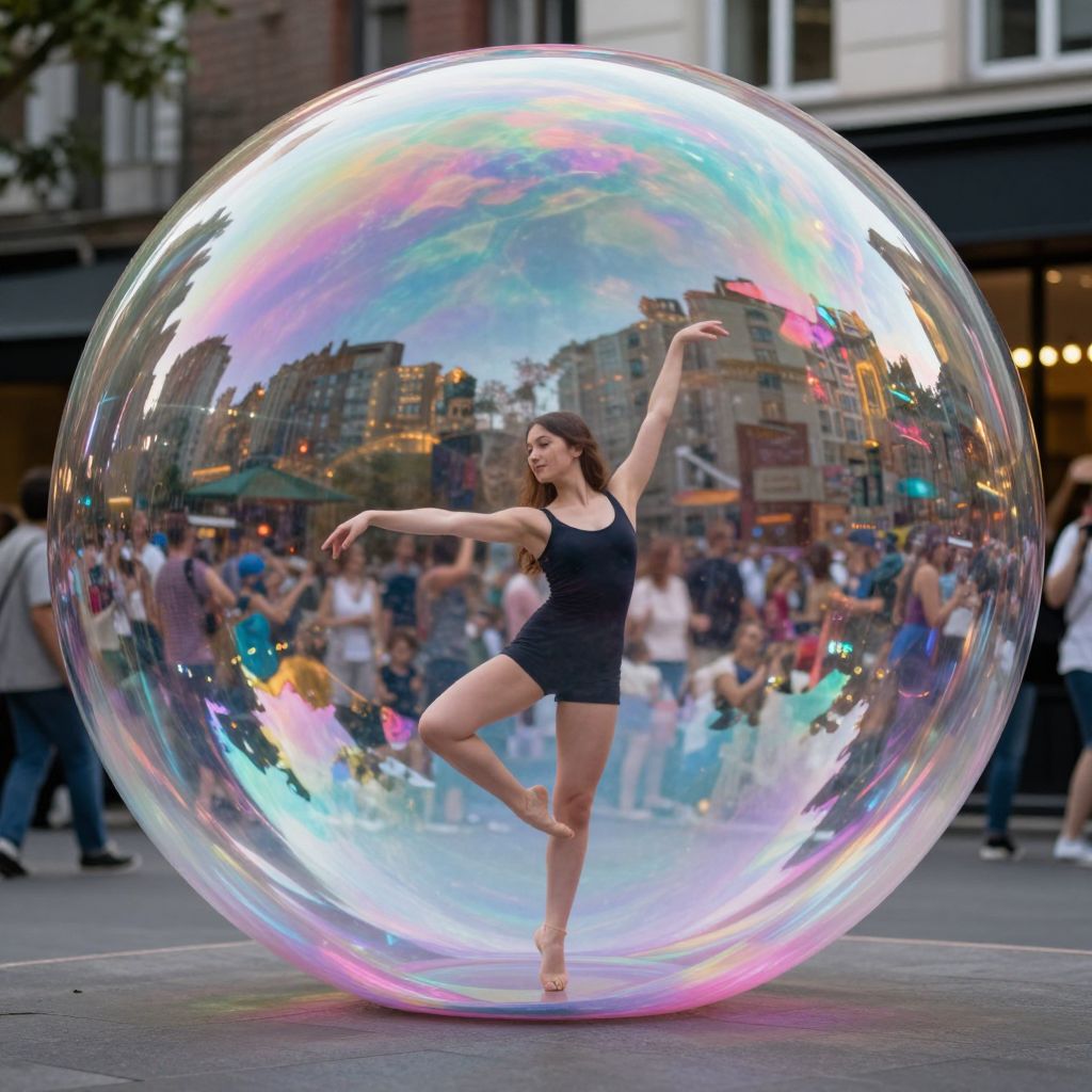 Woman gracefully dancing inside a massive, iridescent soap bubble that encapsulates her and reflects the bustling street scene behind her, creating a surreal contrast between the calm interior and the lively urban environment.