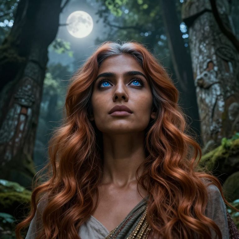 In a breathtaking portrait photograph, an insightful South Asian seer captivates with her striking blue eyes and silver-streaked auburn hair cascading in gentle waves around her face. Bathed in soft moonlight filtering through ancient forest foliage, her expression exudes profound knowledge and timeless understanding. Captured from an unconventional perspective, looking up at her amidst towering stone monoliths, this portrait seamlessly blends ethereal high fantasy beauty with superrealistic textures and intricate details. A world where past and present intertwine effortlessly awaits viewers.