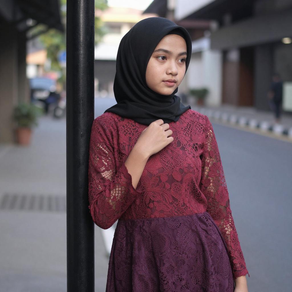 Photograph of an Asian woman with fair skin and black hijab, wearing a gray sleeveless top over a black and white striped shirt. She stands against a colorful wall, looking to the side with a slight smile. Background includes blurred bicycles. Her medium-sized breasts are noticeable under the top.