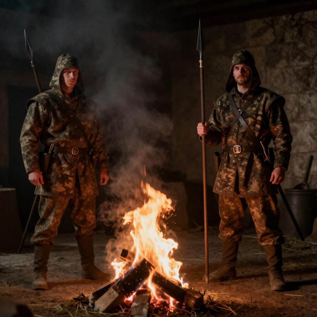 Nighttime photograph of six soldiers in camouflage uniforms around a lit campfire under a tent. One soldier in a beige jacket stands in the center. Blue light illuminates the background. Trees and a wooden fence are visible. Intense expressions.