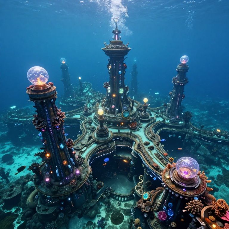 Photograph of a surreal underwater scene featuring four towering, intricately designed, dark metallic structures adorned with glowing orbs and colorful lights. The central structure has a circular base with ornate, winding pathways and more glowing lights. The background is a deep blue, illuminated by sunlight filtering through the water. The structures resemble a blend of steampunk and futuristic design, with gears and mechanical elements adding to the complexity. The scene is rich in texture, with metallic surfaces contrasting against the organic coral and rocky seabed. The glowing orbs emit a soft, ethereal light, enhancing the otherworldly atmosphere.