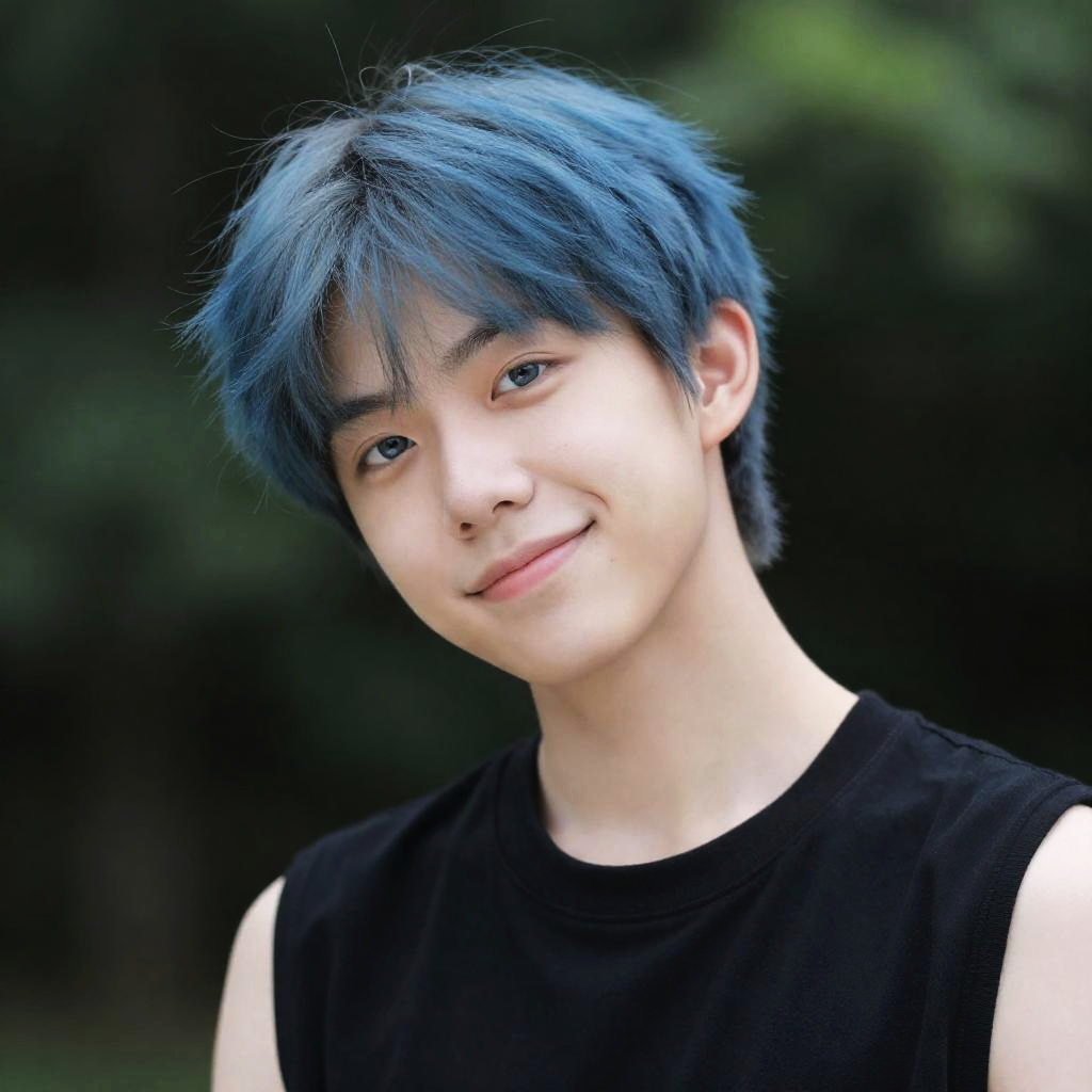 Photograph of a young person with short, dark hair and pale skin. They are wearing a black hooded garment, looking to the right with a slightly intense expression. Background is a ured, light-colored surface. They have dark eyebrows and red lips. Right arm is raised, hand resting behind head. Black clothing contrasts with pale background. Upper body visible.