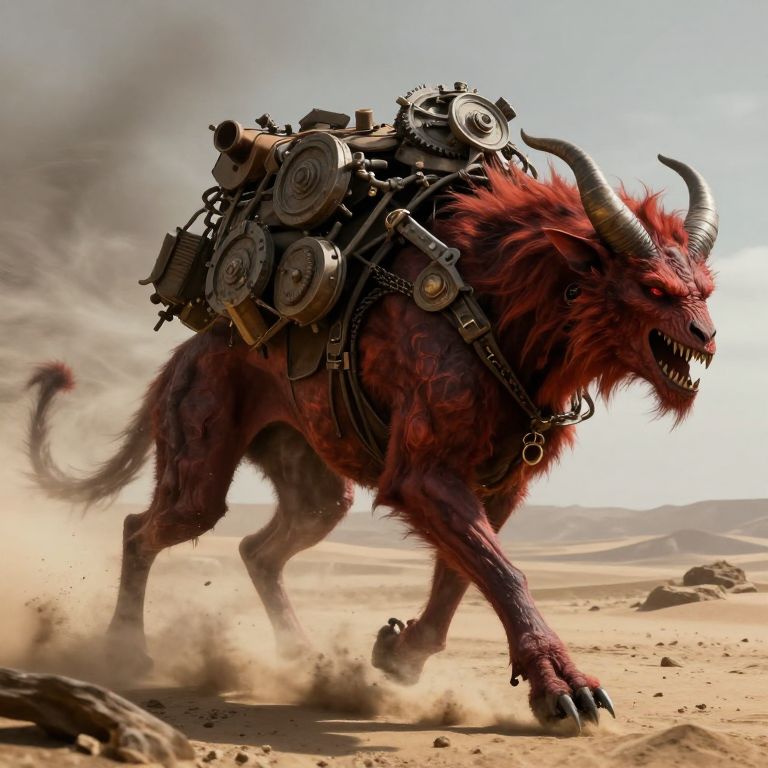 B@rl0w3, A highly detailed fantastical picture of demon in traveling skins wandering the wastelands of hell, Walking with a large hell creature covered in gear, High winds causing sand and debris to kick up against them