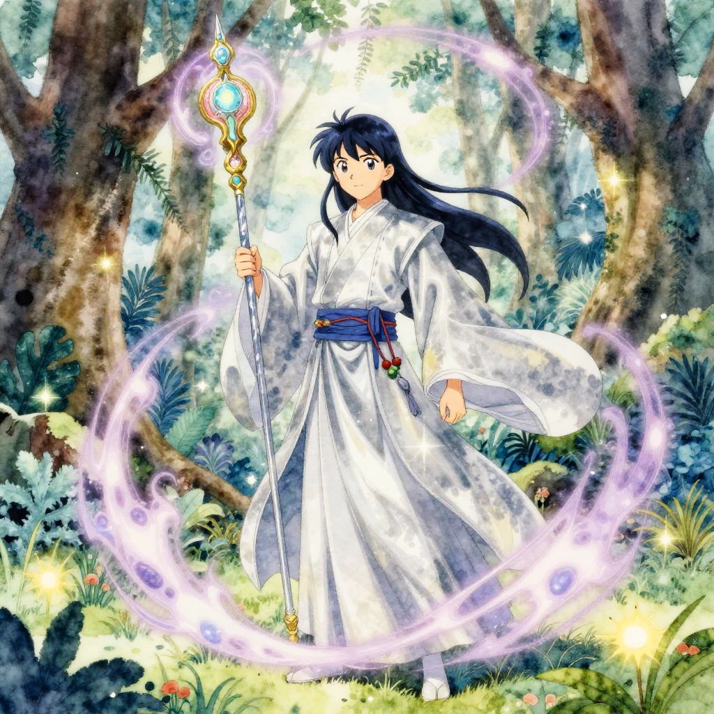 Make a anime character, a young mage with flowing silver robes and an ornate staff, surrounded by swirling magical energy, enchanted forest background with glowing plants, soft pastel colors in watercolor style, ethereal and whimsical atmosphere.