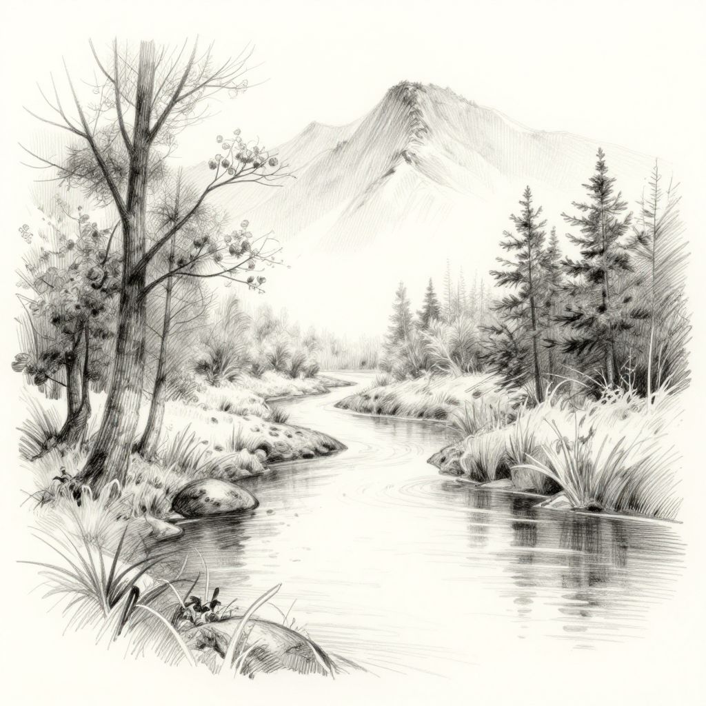 Turn photos into sketches featuring serene nature scenes, with detailed crosshatching and fine graphite strokes illustrating trees, rivers, and mountains, evoking a peaceful hand-drawn atmosphere.