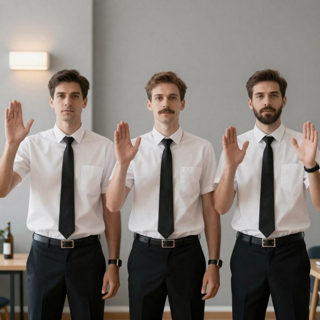 Three men dressed in padded hockey uniforms featuring red, white, and blue colors. Two men wear helmets with face cages, while the center man holds a red helmet. All are wearing hockey gloves and protective gear including shorts and padded socks. Background includes two wall clocks, buttons on the wall, and a red shirt hanging on a hanger. The setting suggests an indoor locker room or sports facility.