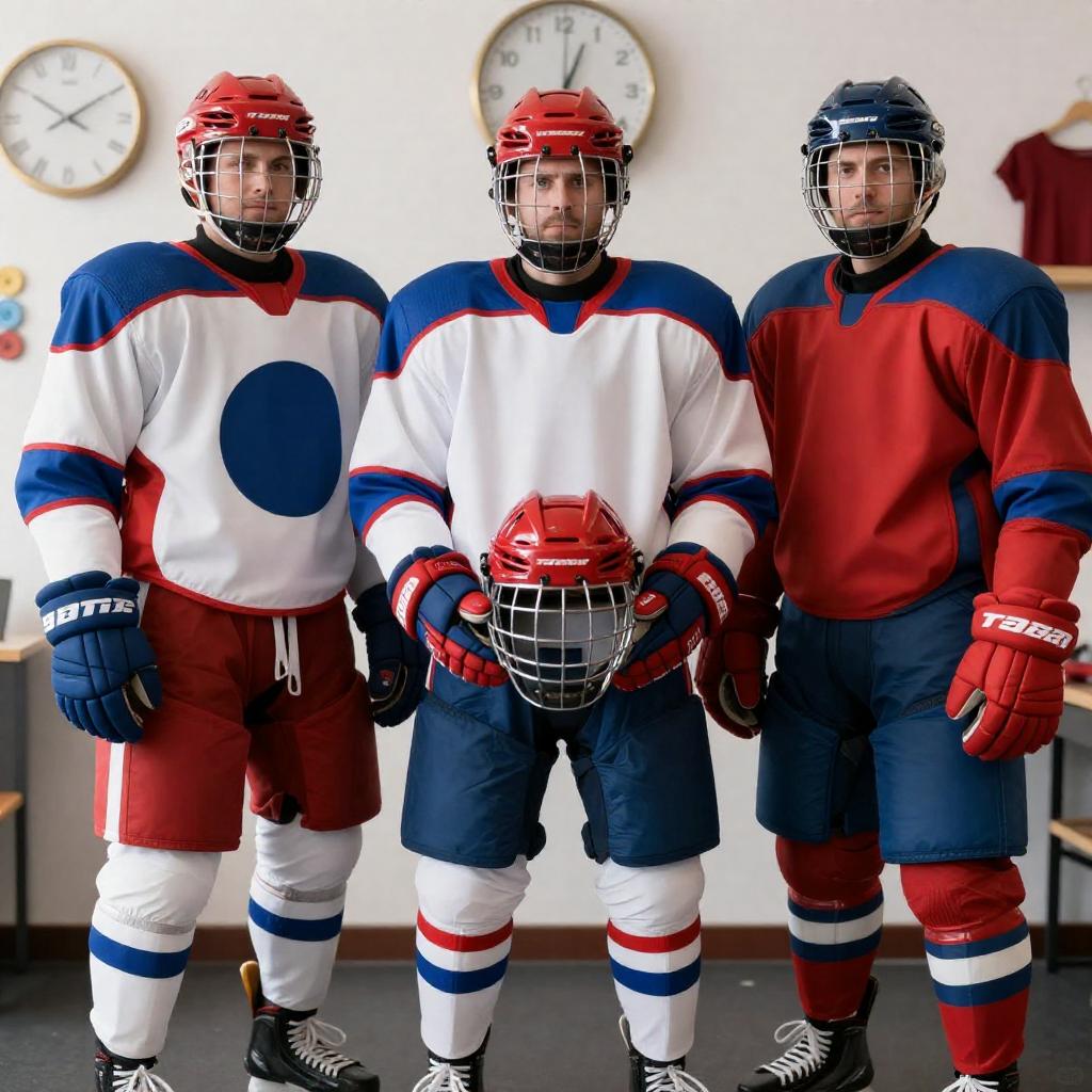 Photograph of three men in colorful, padded hockey gear with red, white, and blue accents. Center man holds red helmet with intense expression, right man holds large padded gloves, left man stands with laces visible. Background has clocks, buttons, and a woman in a red top.