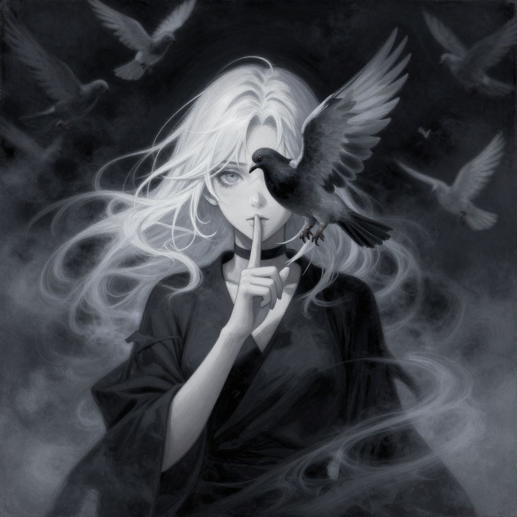 An Acrylic style painting that is expressive, gives it a dynamic and emotional quality, Anime art of a stylized portrait of a woman with a ethereal black and gray mist surrounding her body, The mist creates a dramatic and surreal effect, A pigeon's wing, which flies, covers one of the eyes, the front of the face, The woman has a cold aesthetic, complimented by her white hair, Anime art of woman draped in shadows with a lighting that enhances her unique features, The background is dark gray, filled with a pigeon swarm flying, Holding finger to lips, shush, shushing motion