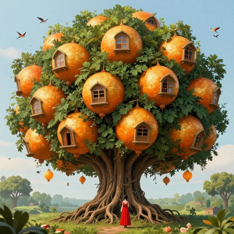 Vividly perched atop a sprawling tree, numerous golden-orange domes, resembling oversized fruits, house windows and doors, blending seamlessly with lush green foliage, while intricate root systems extend outward, grounding the fantastical structure as a solitary figure in a red dress stands below, gazing upward amidst a serene landscape dotted with birds and hanging lanterns.