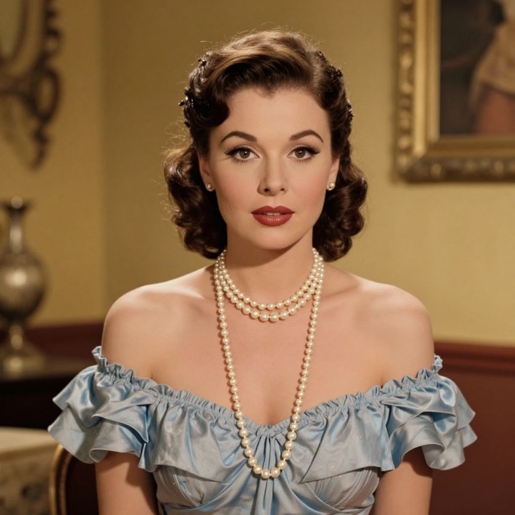 A digitally rendered portrait captures the essence of old Hollywood glamour, featuring a woman with vintage styling, including a classic pearl necklace and off-the-shoulder ruffled dress, set against a warm, retro-inspired interior with soft golden lighting and elegant decor.