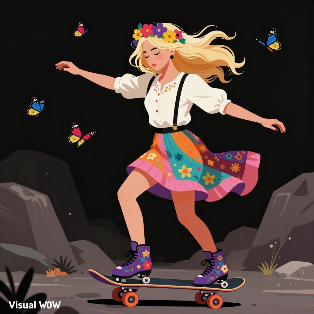 Digital illustration of a blonde woman with wild hair, wearing a colorful floral headpiece, white blouse with black suspenders, and a multicolored skirt. She is skateboarding through a dark, rocky landscape with butterflies flying around her. She has her eyes closed and arms outstretched. She wears purple roller skates with floral patterns. The background includes rocks and dark shadows. The artist's name, Visual W0W, is in the bottom left corner.