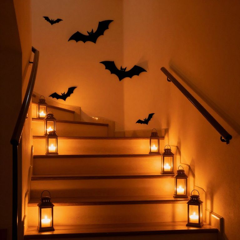 Staircase illuminated by warm orange lights and decorated with four black bat decals soaring above, creating a spooky Halloween ambiance with glowing lanterns placed strategically along the steps and landing.
