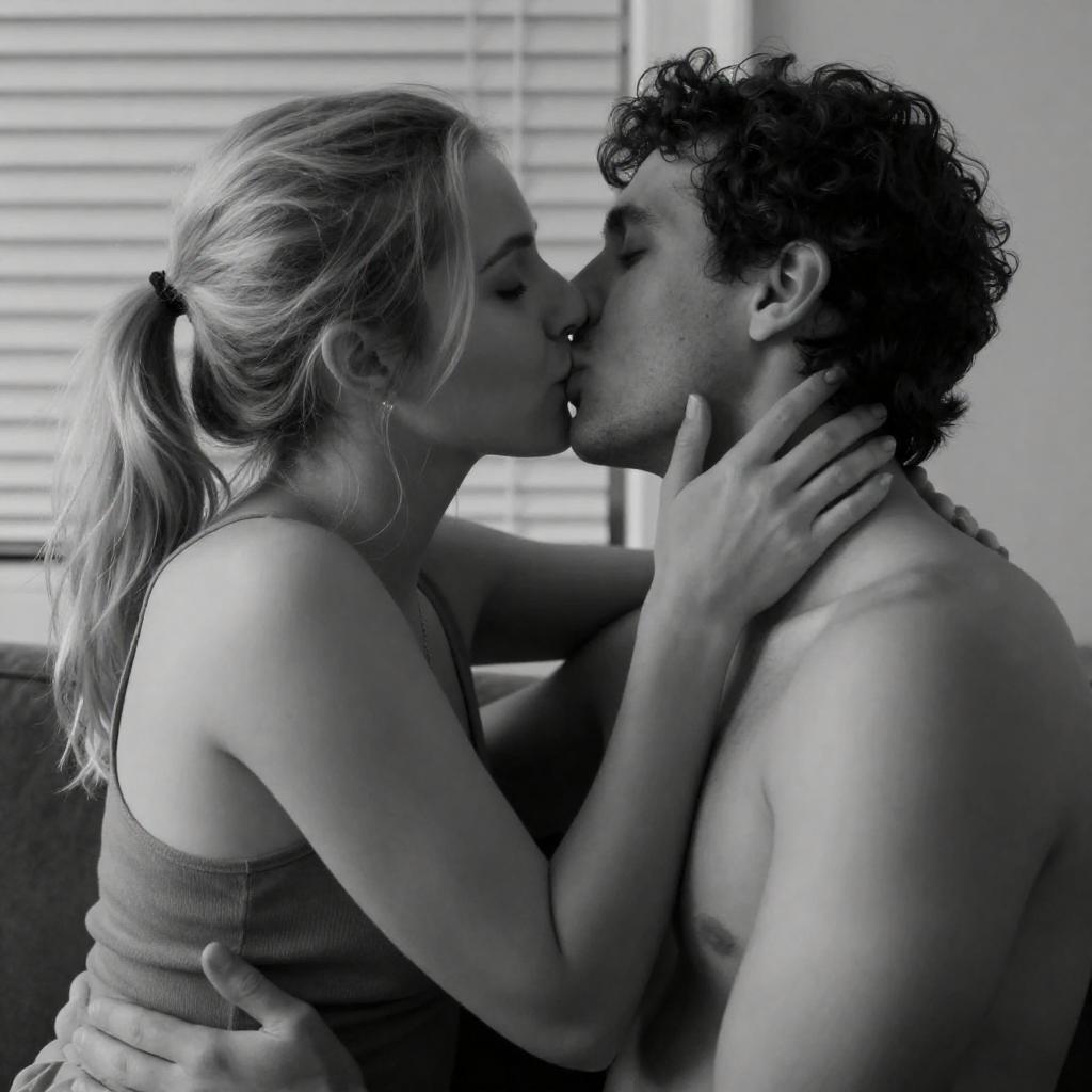 Black-and-white photograph of a couple kissing. Woman with blonde hair in a ponytail, wearing a sleeveless top, kisses a man with curly dark hair, shirtless. She cradles his face with her right hand, both eyes closed. Background includes blinds and a pillow. Intimate, passionate moment.