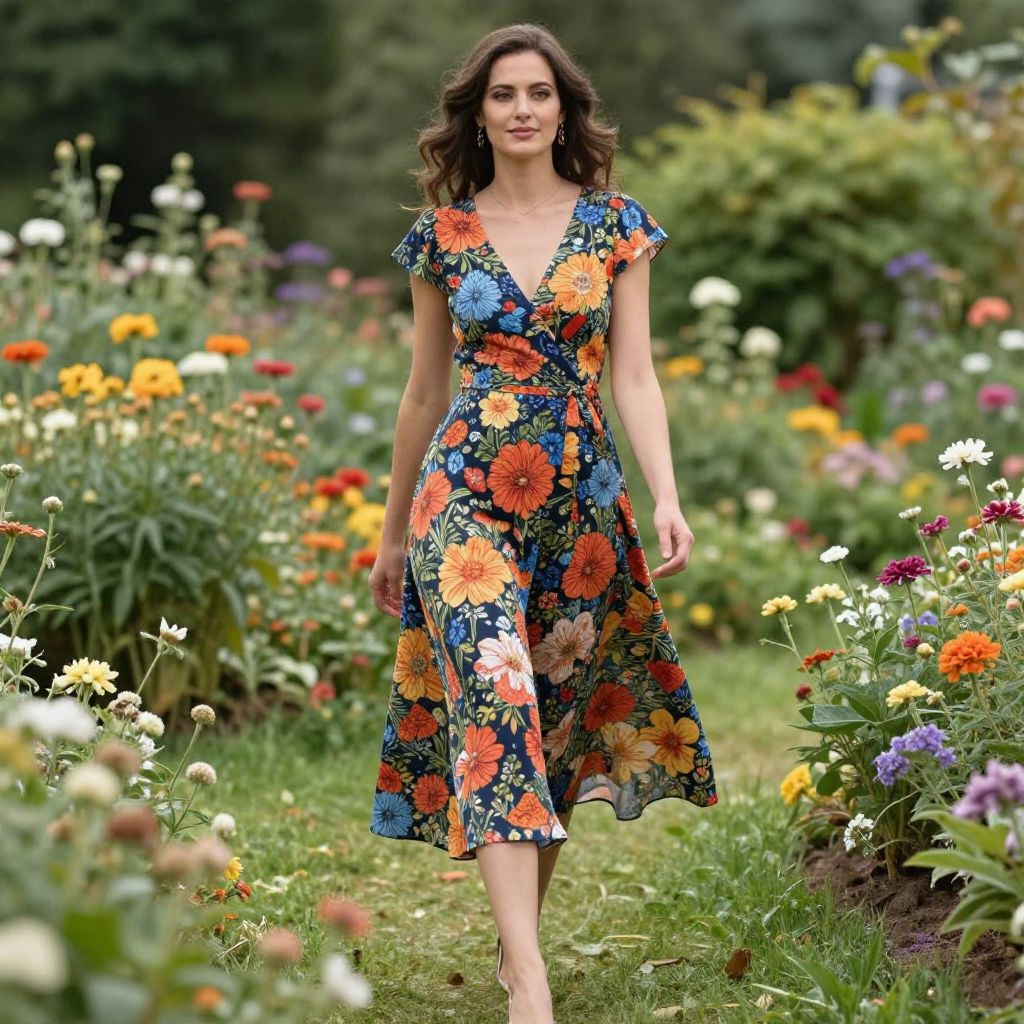 A woman strolls gracefully through a lush garden, showcasing a vibrant floral dress that perfectly complements the colorful surroundings. The scene captures the essence of nature's beauty and elegance, making it a perfect representation of a serene outdoor experience.