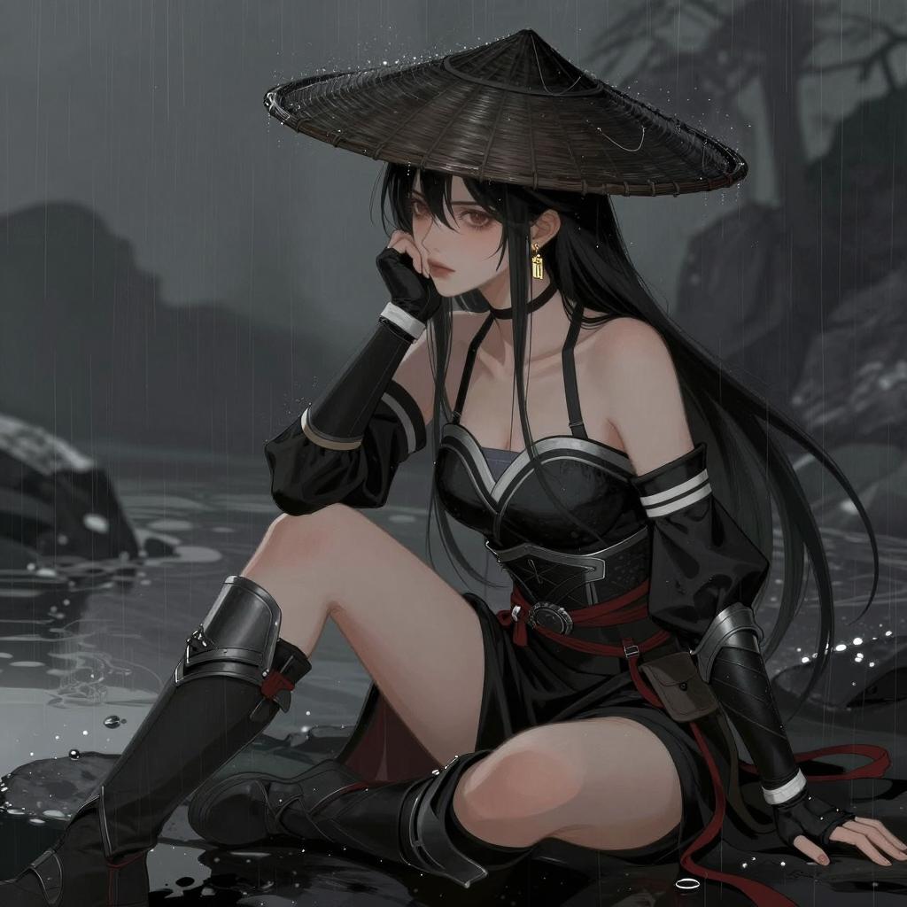 Illustration of a female warrior with long black hair, sitting on a wet surface. She wears a large conical hat, black armored outfit with white stripes, fingerless gloves, and red ribbons. She rests her chin on her hand, looking to the side. Gold earrings visible. Rain falling. Waterlogged background. Her expression is serious and contemplative. She has a lean build and fair skin. She sits with one leg bent, the other folded underneath. Dark, moody color palette. Artist unknown.