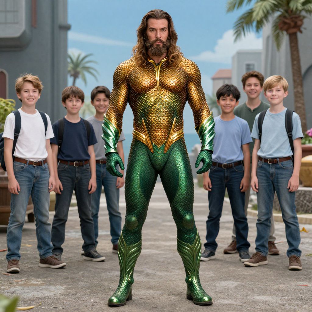 Aquaman kostum costume, beard, male focus, long hair, facial hair, gloves, multiple boys, solo focus, boots, brown hair, full body, standing