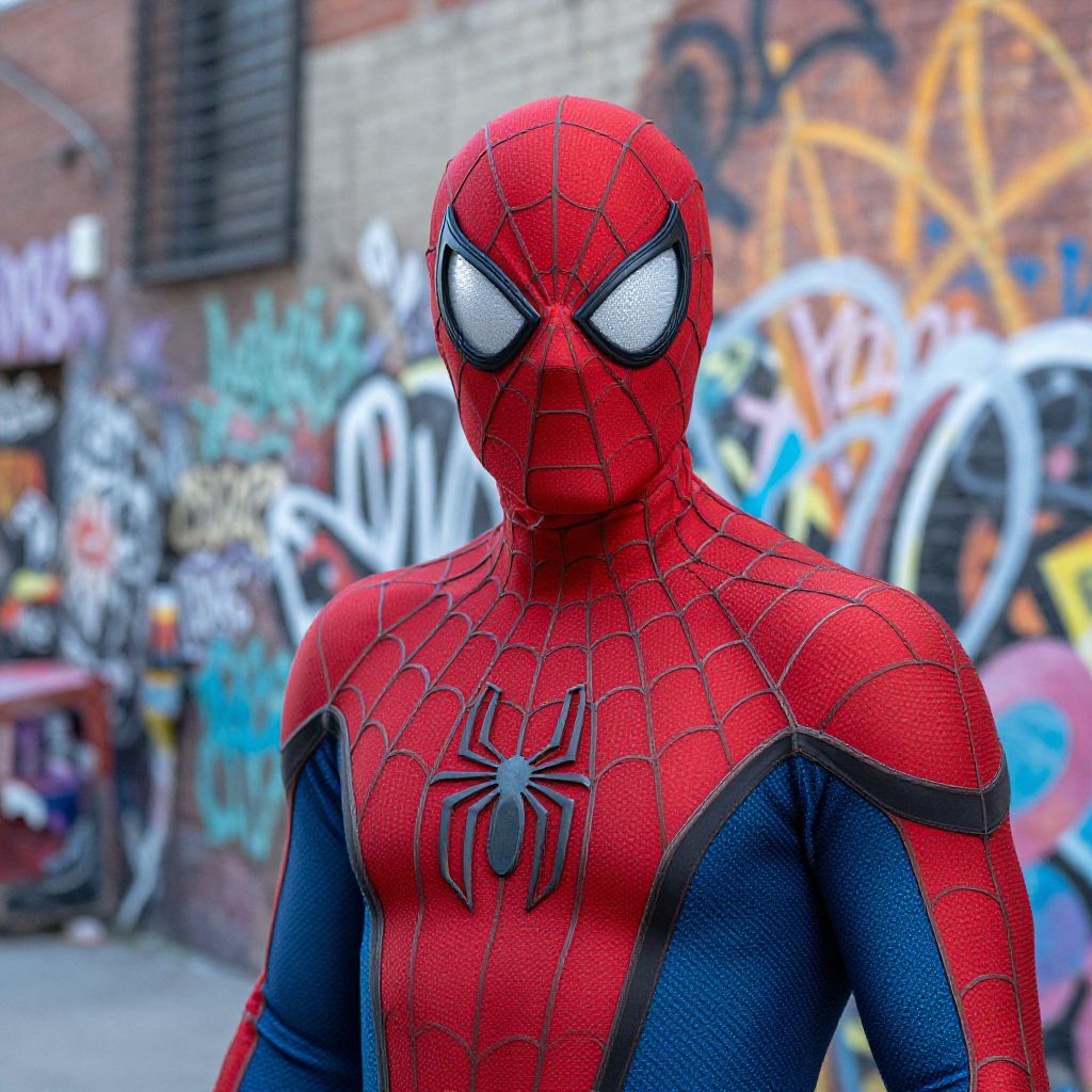 Photograph of Spider-Man in red and blue suit, mid-air jump, on a city street with blurred pedestrians and buildings.